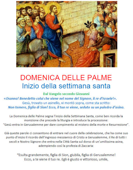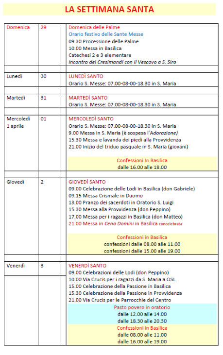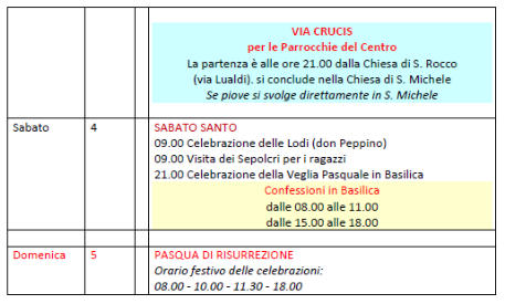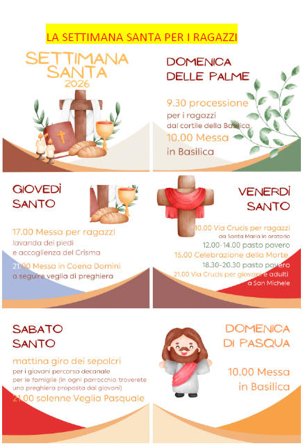 UN PASTO POVEROUna minestra e un pane nel giorno del Venerdì SantoLa giornata del Venerdì Santo è dedicata al digiuno: rinunciare al cibo, e non solo, pensando ai fratelli che non hanno il necessario per vivere. Per dare un senso al digiuno, venerdì 3 aprile presso l’oratorio S. Luigi (via Miani, 3) sarà possibilecondividere un pasto povero (pranzo e cena); insieme pregheremo, mangeremo minestra e pane (pasta per i più piccoli) e raccoglieremo delle offerte da destinare aprogetti in favore dei più bisognosi. Gli orari sono: pranzo dalle 12.00 alle 14.00 - cena dalle 18.30 alle 20.30.Buona Santa Pasqua a tutti!PANE DEL VENERDÌ SANTOAl termine della Celebrazione della Passione di Gesù delle ore 15 troverete all’uscita della Chiesa un sacchetto con il “Pane” del Venerdì Santo.Chi vorrà, potrà lasciare un’offerta che andrà alla Caritas Parrocchiale di San Giovanni.